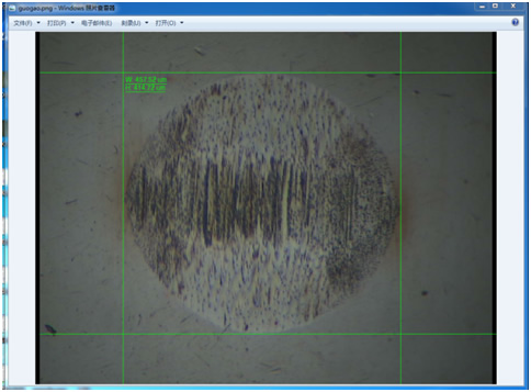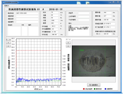 3、軟件系統:試驗操作界面中可隨時調取ISO 12156.1-2018標準中對環境允許范圍(溫度、相對濕度)標準圖形;該軟件控件平臺同時可自動控制、數據采集、數據實時監控、數據計算、形成報告、參數標定及試驗后數據瀏覽等,同時可連接中石化、中石油集團實驗數據庫將實驗數據及資料實時上傳、共享。試驗結束后,系統自動停機,磨斑拍照測量后,可將磨斑圖片嵌入試驗報告中形成一份完整的試驗報告。圖例如下: