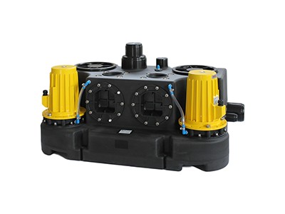 PE塑料箱體,內裝單向閥,Y型管,壓力排水管DN100法蘭片和柔性連接,帶管箍的通氣管連接、平穩的氣動液位控制,緊湊的雙泵提升站