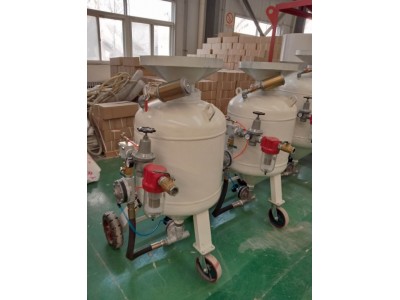整機(jī)工作原理:壓縮空氣經(jīng)過(guò)竹節(jié)接頭進(jìn)入噴砂機(jī)壓力罐內(nèi),錐形封閉閥頂上,壓力罐密封。壓力管內(nèi)的磨料流入砂閥,壓縮空氣在砂閥處與磨料混合,經(jīng)噴砂管從高速噴嘴噴出,對(duì)工件進(jìn)行處理。