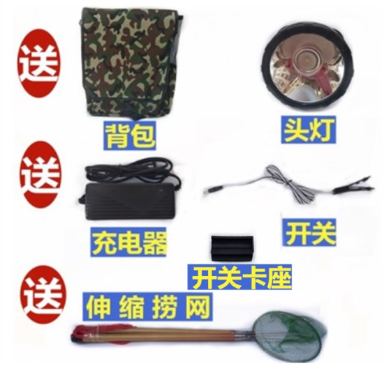 隨機(jī)配送:伸縮撈網(wǎng)一套 精致背包一個(gè) LED頭燈一個(gè) 防水開(kāi)關(guān)一個(gè) 開(kāi)關(guān)卡座一個(gè) 說(shuō)明書(shū)及保修卡