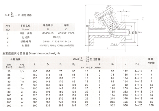是用來清除腐蝕性介質中的雜質,保護泵、閥門及其它設備的正常使用。一般通水網為20-60目/cm2,通氣網為40-100目/cm2通油網為100-480目/cm2。可根據介質相應配置。由于過濾器內壁及濾網均采用耐腐蝕性極強的四氟制成,因此該