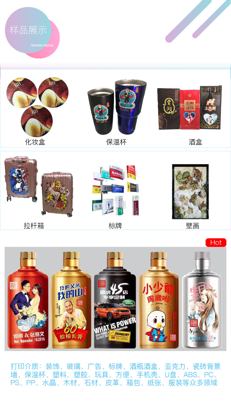 可應用于平面材質的產品:瓷板、玻璃、亞克力、PVC、ABS、有機板、金屬、木板、塑料塑膠、石材、皮革、建材、裝飾裝修材料、硅膠、3D立體畫光柵板、光柵片及其它帆布、油畫布、燈箱布、 不限材質、不限圖案彩印