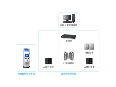 在一樓大廳部署自助訪客機,在管理中心部署訪客管理系統(tǒng),通過交換機連接自助訪客機,通道閘控制系統(tǒng),電梯控制系統(tǒng),通道閘進出安裝二維碼讀頭,通過自助訪客機申請后打印二維碼憑條,到通道閘掃碼開閘及聯(lián)動呼梯。