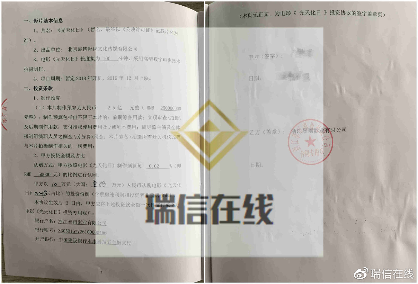 浙江暴雨影業有限公司正規嗎?投資《光天化日》被騙怎么辦?詳情咨詢瑞信維權(vx:1052140986)!趙云峰帶單炒投資電影,眾籌影視為什么一直虧損?虛假影視項目頻繁虧損是為什么?虧損如何追回?對自己虧損有疑問的都可以來咨詢瑞信維權(vx:1052140986),維權周期兩周左右,前期不收取任何費用,過程公開透明,一定要及時拿起武器維護自身權益!