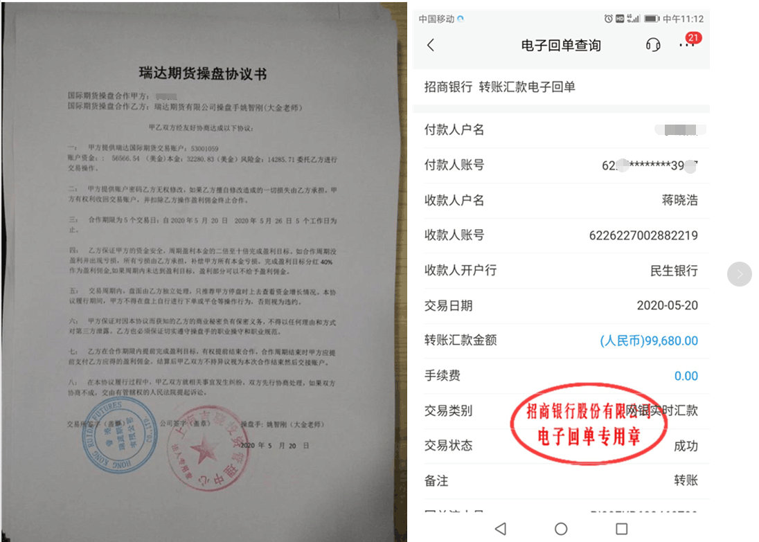 據另一名投資者描述他的經歷又是截然相反,李先生說他在瑞達期貨投資平臺投入了40萬,他不斷沒有虧錢反而賺了80多萬,但是不能出金,問題出在老師替他操盤簽了一份操盤協議,協議中說明盈利了委托人要支付40%盈利分成,在與老師協商后老師答應李先生先支付10萬元,就可以出金了,當李先生真的把10萬打過去后,老師又說公司不同意,必須將盈利分成32萬元全部支付才能給出金,直到這一刻李先生才醒悟他們這是連環套,入金40萬加上分成10萬,他已經被騙50余萬,從上面兩個案例你能看出什么嗎?他們為了快速收割已經不測手段了,如果你也遇到這樣的投資騙局保存好相關證據,聯系我,幫你出謀劃策,提供法律援助,幫你挽回損失。