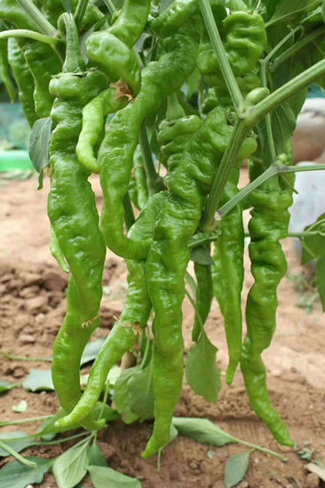 6、線椒苗:中早熟品種,株型矮小緊湊,生長勢強,株高約75厘米,果實簇生,長指形,果長15厘米。辣味適中,商品性佳,具有良好的抗病性、豐產性、穩產性,多種加工特性。