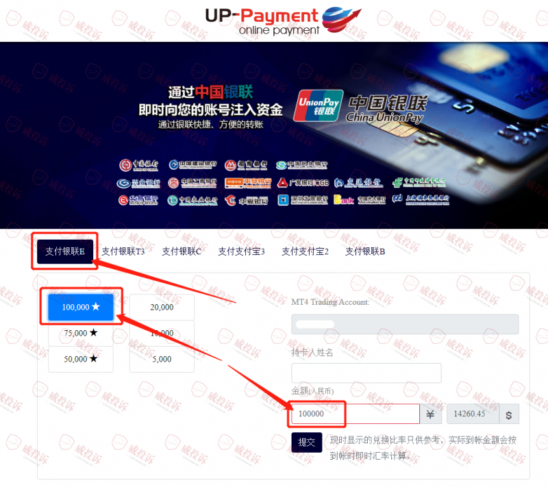 且看下圖,支付通道E (Easy Pay)可以一次經(jīng)個(gè)人轉(zhuǎn)賬的方式入10萬人民幣,每天沒有次數(shù)限制,雖然現(xiàn)在國家是在嚴(yán)打非法資金,正所謂道高一尺,魔高一丈,許多無知的投資者把大筆的資金轉(zhuǎn)入到非法炒匯平臺(tái),等發(fā)現(xiàn)受騙上當(dāng)之后才來維權(quán)立案,往往都是為時(shí)已晚。