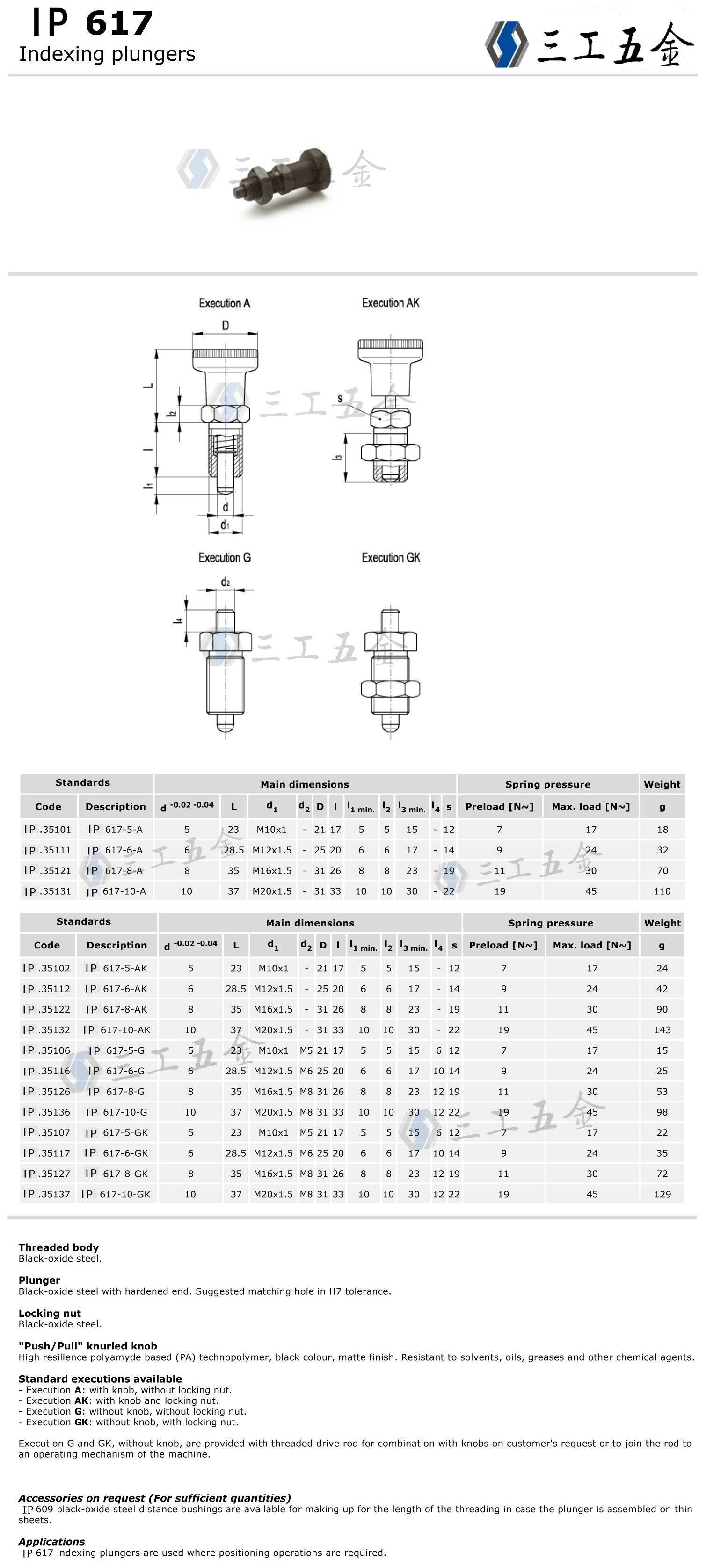 “三工五金專業(yè)生產(chǎn)IP617復(fù)位型分度銷、定位銷、旋鈕柱塞”參數(shù)說明