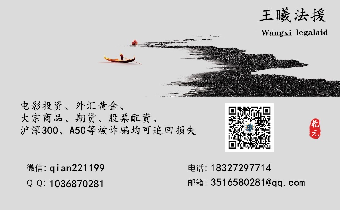 眾多文章中,我選擇了王曦法援。抱著試一試的態度,我主動聯系了他們。當時我其實也沒抱多大希望,就死馬當作活馬醫委托了幫處理這件事情,而且事前也不會收取任何費用,就這樣一個星期過后,平臺突然給我打電話談到賠償和解問題,答應賠付我虧損。維權咨詢王曦法援(V:qian221199/Q:1036870281)