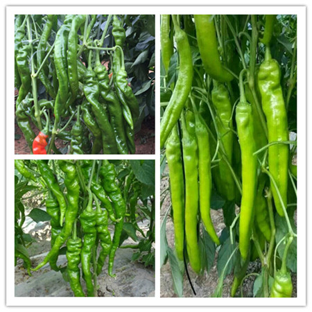 進(jìn)口品種,比國內(nèi)品種增收20%以上,弱光照射、低溫條件下連續(xù)坐果能力強(qiáng),膨果速度快,果皮黃綠色,中前期坐果集中,后期不早衰。植株長勢旺盛,抗病能力強(qiáng),果長30-38cm。粗4-5cm,單果重150-180g。中等辣度。