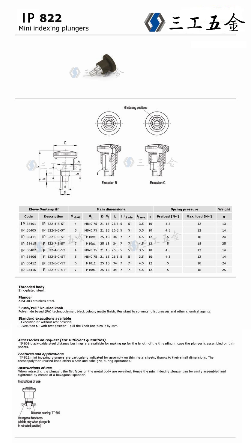 “三工五金專業(yè)生產(chǎn)IP822迷你型旋鈕柱塞”參數(shù)說明