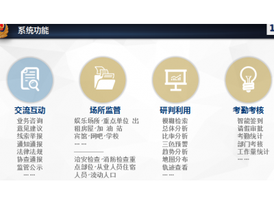 該系統(tǒng)主要包括智慧辦公、數(shù)據(jù)整合、分析研判、防控預(yù)警、監(jiān)管考核、系統(tǒng)管理等模塊全部覆蓋行業(yè)場(chǎng)所治安管控的各個(gè)要素(除了一般設(shè)置九小場(chǎng)所治安管控外,其他場(chǎng)所可結(jié)合實(shí)際片區(qū)區(qū)域場(chǎng)景增加)。
