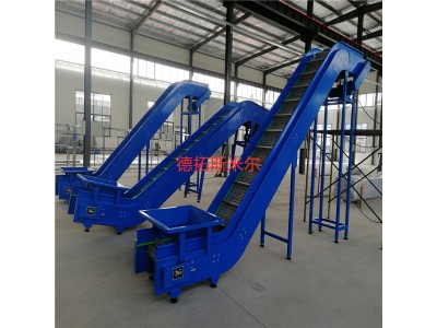 鏈板輸送機(jī) :是一種以標(biāo)準(zhǔn)鏈板為承載面,由馬達(dá)減速機(jī)為動(dòng)力傳動(dòng)的傳送裝置。鏈板式輸送機(jī),由動(dòng)力裝置(電機(jī))、傳動(dòng)軸、滾筒、張緊裝置、鏈輪、鏈條、軸承、潤(rùn)滑劑、鏈板等等構(gòu)成。其中帶動(dòng)物料的輸送的主要的兩個(gè)部分為:鏈條,利用它的循環(huán)往復(fù)運(yùn)動(dòng)提供牽引動(dòng)力;金屬板,作為輸送過程中的承載體。可以通過多列鏈板并行,使鏈板輸送機(jī)做的很寬并形成差速,利用多列鏈板的速度差使多列輸送在無(wú)擠壓的情況下變?yōu)閱瘟休斔停瑥亩鴿M足飲料貼標(biāo)、灌裝、清洗等設(shè)備的單列輸送的要求,我們可以將兩條鏈板輸送機(jī)的頭尾部做成重疊式的混合鏈?zhǔn)沟闷浚ü蓿w處于動(dòng)態(tài)過度狀態(tài),使輸送線上不滯留物料,可以滿足空瓶以及實(shí)瓶壓力和無(wú)壓力輸送。