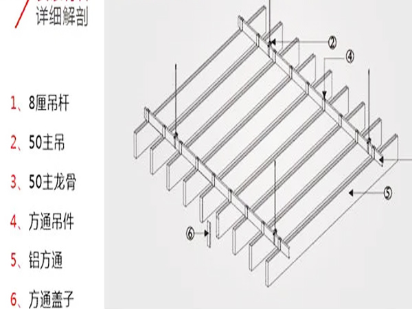 鋁方通安裝配件:1、吊桿2、拉爆頭3、螺母4、主龍骨 5,主龍骨吊碼6,主龍骨接件7,修邊角8,吊掛彈簧
