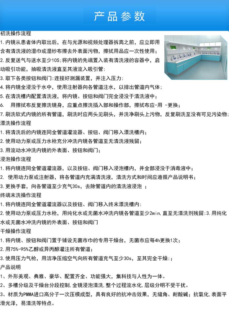 內鏡一體化清洗工作站是嚴格按照衛生部《內鏡清洗消毒技術規范( 2004年版)》的要求精心設計,產品本著人性化與自動化理念,有引進國內外設備和設計理念,人性化關懷更強,充分體現了人機的結合。內窺鏡清洗工作站規范化的生產程序包括:選材、配料、模具、成型,打磨、加固、拼裝破壞性實驗檢測、裝飾裝修等:產品力求精益求精,到客戶滿意為止。多種組合方式,靈活方便,滿足不同醫院房間的需求,不同診療規模,不同的洗消習慣等,為每一家醫院和科室量身打造,普通、標準、豪華由您掌控 !您的滿意就是我們的追求!