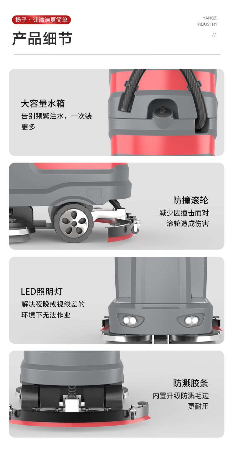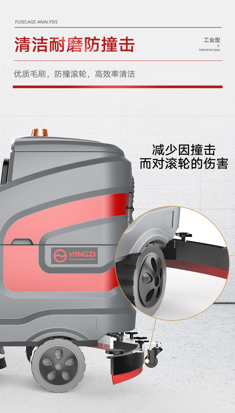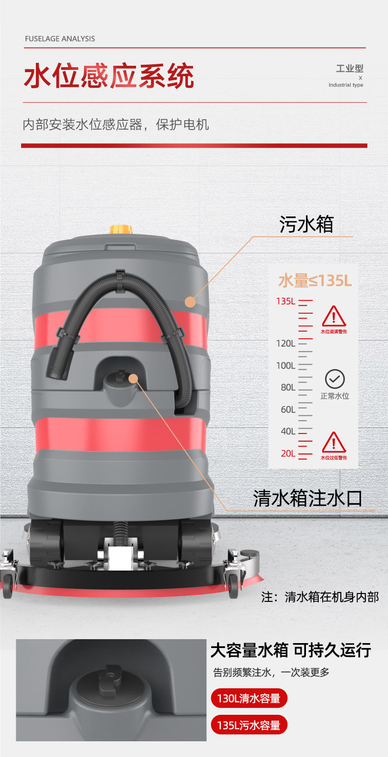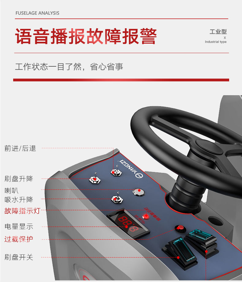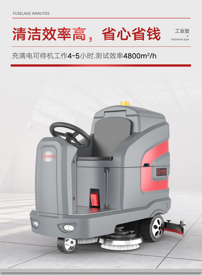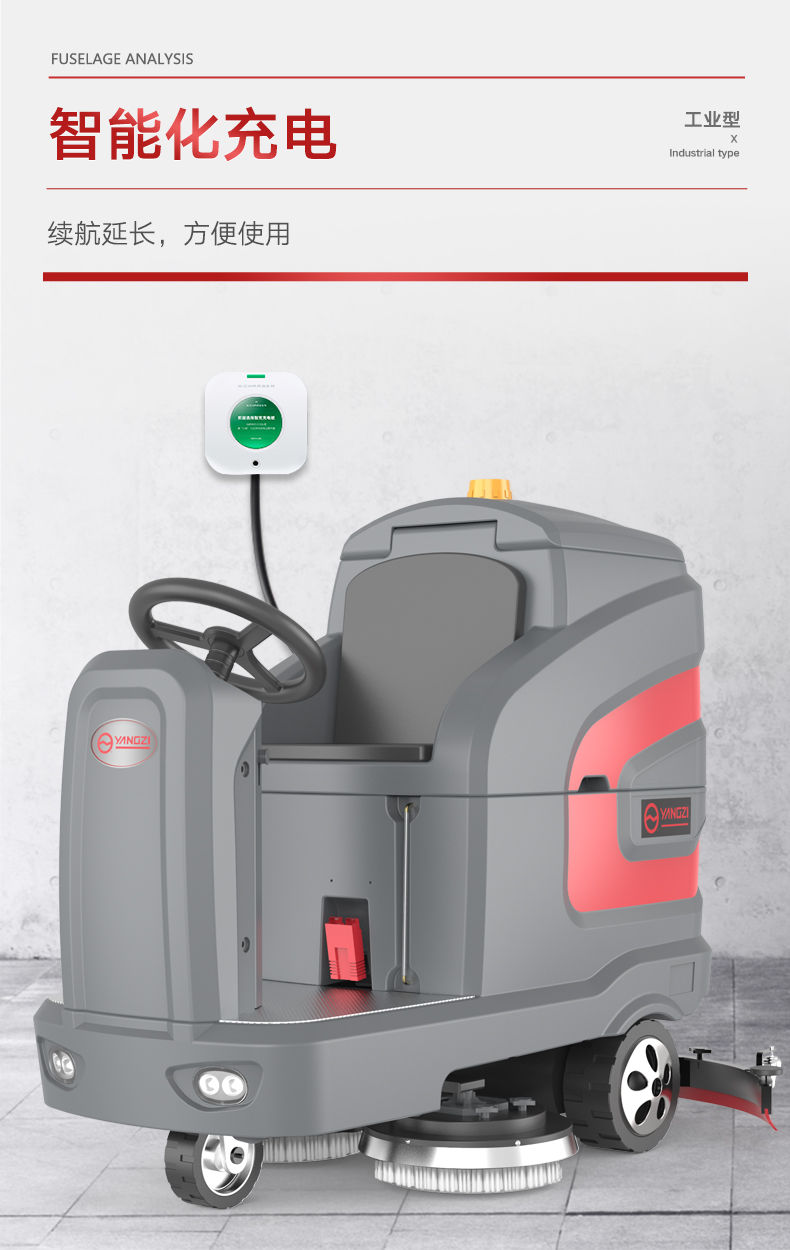 揚(yáng)子X7駕駛式洗地機(jī)車 配置有200Ah天能電瓶,品牌電瓶可以增長(zhǎng)機(jī)器的使用壽命,后期更換更加方便。大容量138L的清水箱,可持久使用,不用頻繁換水,效率更高,每小時(shí)可清潔6000m,智能化操作系統(tǒng),如水位感應(yīng)器、語(yǔ)音播報(bào)、智能充電,操作更容易上手,并且使用的是阿美德格進(jìn)口電機(jī),比普通電機(jī)的壽命高6倍,輕松降低地面揚(yáng)塵污染,給員工提供干凈舒適的就業(yè)環(huán)境!轉(zhuǎn)彎靈活,清潔不留死角,操作輕便,采用電池驅(qū)動(dòng),無噪音,節(jié)能環(huán)保,無二次污染。可免工具更換刷盤及吸水膠條。