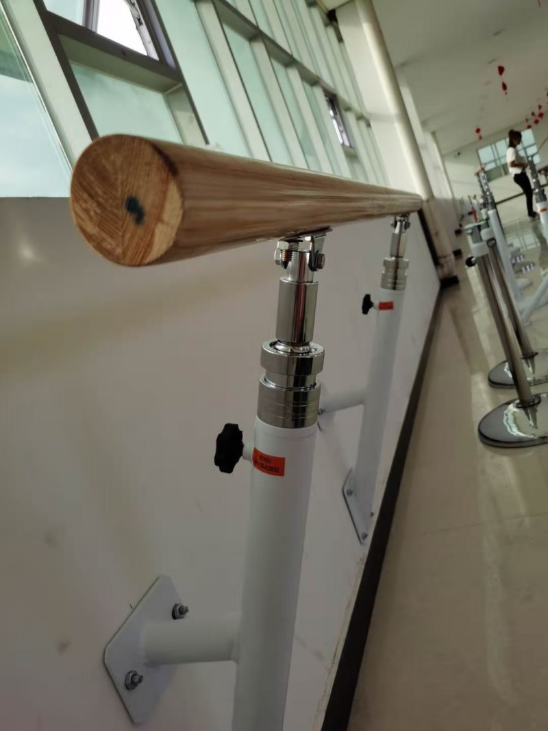 產品材質:壁掛升降式舞蹈把桿支架,表面白色為噴塑處理立柱采用無鋒鋼管,電鍍處理升降立柱采用實心圓鋼,帶碰珠升降,雙扣鎖實,