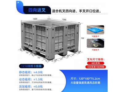 卡板箱網格款采用網格鏤空設計,具有良好的通風性,防水防潮保障貨物處于通風狀態(tài)。沿口網格結構加強筋,有效抵抗外部沖擊,使用壽命更加長久。