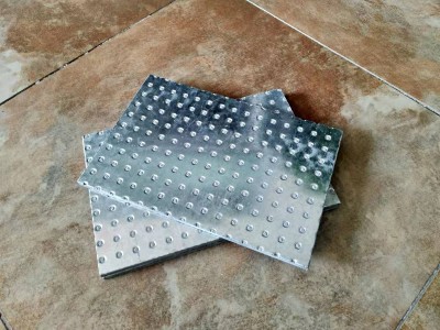 抗爆板是采用三明治結構組成,表層結構為0.5mm鍍鋅鋼板,夾層為纖維水泥板。表層鋼板是20mm間距,全部打出5mm的圓孔,孔內鋼板為鋸齒狀,深入水泥層,用高壓將三者緊密結合,水泥凝固時即成為兼具鋼板與水泥功能的抗爆板。