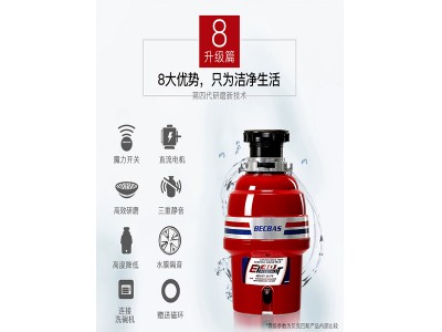 貝克巴斯是*早引進食物垃圾處理器的公司。成立于1997年,并承接一個使用食物垃圾處理器的精裝項目“密云云湖度假村”。行業(yè) 內*一擁有尖端恒速直流永磁電機及四級研磨技術的公司以卓越的產品性能與完善的安裝及售后服務體系而著稱,在各渠道銷量均名列前茅。貝 克巴斯食物垃圾處理新主張,省時省力、衛(wèi)生健康。8大優(yōu)勢,只為潔凈生活。力開關,無須打孔。遙控開啟,輕輕一按,搞定廚余垃 圾。強勁直流永磁電機,啟動扭矩大,拒*卡頓。*效研磨,處理更多廚余。三重靜音,拒*擾民。高度降低,節(jié)省空間。底部設計,預留更多空 間。水膜隔音防濺罩,具有良好的隔音效果,減少填塞阻力。連接洗碗機,省時省力,洗碗同時處理殘余垃圾。水槽口配有磁環(huán),有效減少刀 叉等鐵質金屬物品掉入機器內部的幾率。用心細節(jié),呵護你的健康。