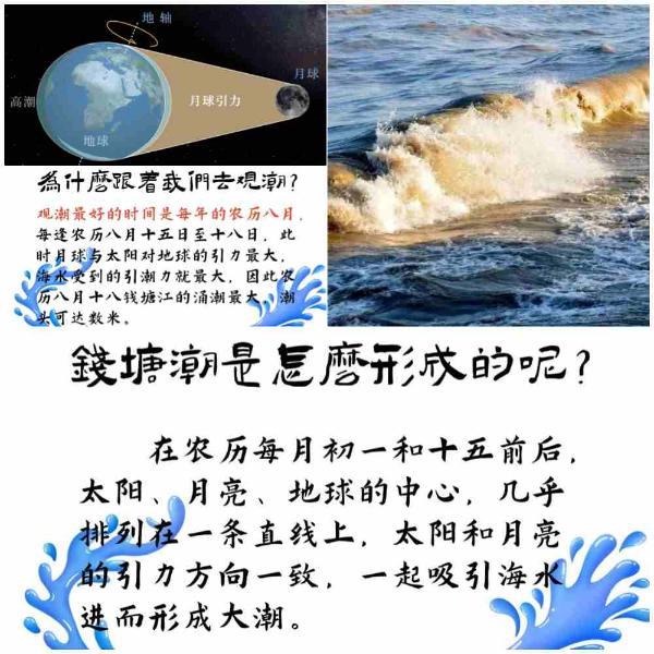 到觀潮現(xiàn)場(chǎng)去見見,古往今來文人墨客筆下的涌潮,一線潮、交叉潮、回頭潮,不同種類的潮有什么區(qū)別渾厚的浪潮在洶涌的咆哮,想要將答案一一告訴孩子們。