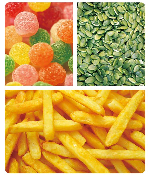 瓜子、花生、果仁、杏仁、葡萄干、糖果、開心果、薯片、蝦條、餃子、肉丸等顆粒、膨化、五金件等各種顆粒狀、片狀、條狀、圓狀及不規則物料的定量稱重。