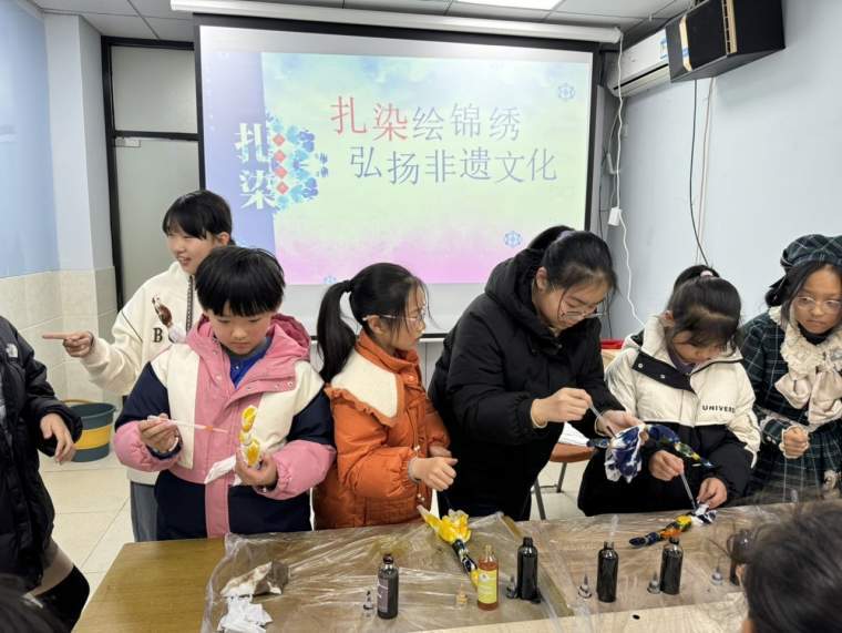 完成扎結后,小組共同調配染料,將扎好的布料放入染缸進行染色。在染色過程中,青少年可以觀察布料顏色的變化,根據自己對顏色的需求掌握染色時間。染色完成后,進行清洗、拆線等后續操作,最后將作品掛在指定區域晾干。