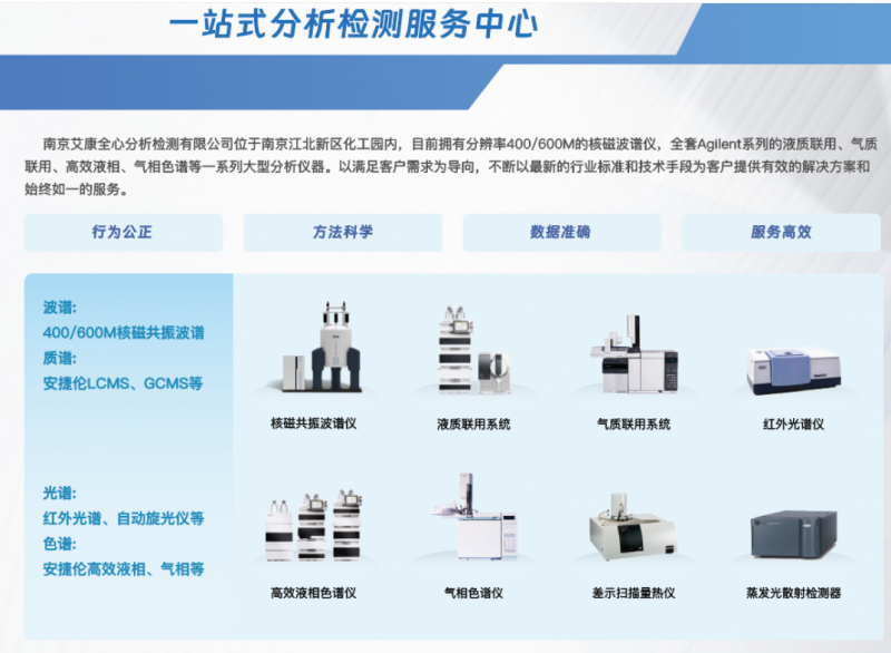 南京艾康全心分析檢測中心目前擁有國內xian進的高分辨率400M的核磁共振波譜儀,全套Agilent系列的液質聯用儀、氣質聯用儀、高效液相儀、氣相色譜儀以及各種理化分析儀器等一系列大型分析儀器。