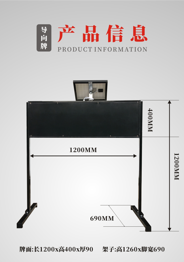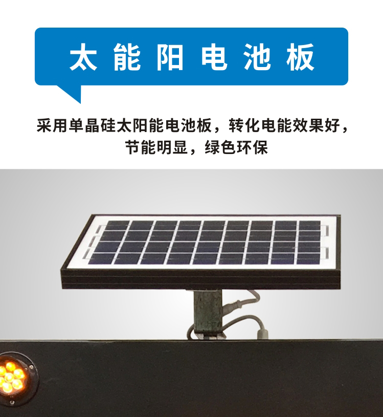 太陽能交通標(biāo)志是交通標(biāo)志牌的一種,由標(biāo)志面、標(biāo)志底板、太陽能電池板、控制器、發(fā)光單元(LED)組成,用文字與圖案傳遞警告、禁令、指示信號給司機(jī)和行人,用以管理道路交通的安全設(shè)施。白天太陽能電池板吸收太陽光,把太陽能轉(zhuǎn)化成電能,儲存在儲能器件中,晚上,儲能器件中的電能自動轉(zhuǎn)化成光能(通過光電開關(guān)控制),通過LED發(fā)出亮光來勾畫圖案輪廓,傳達(dá)交通信息。它給道路使用者以確切的道路交通信息,保障道路安全。